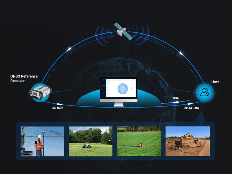 Système GNSS CORS hautes performances offrant des corrections RTK rapides, stables et précises pour l'agriculture, l'arpentage et la robotique.