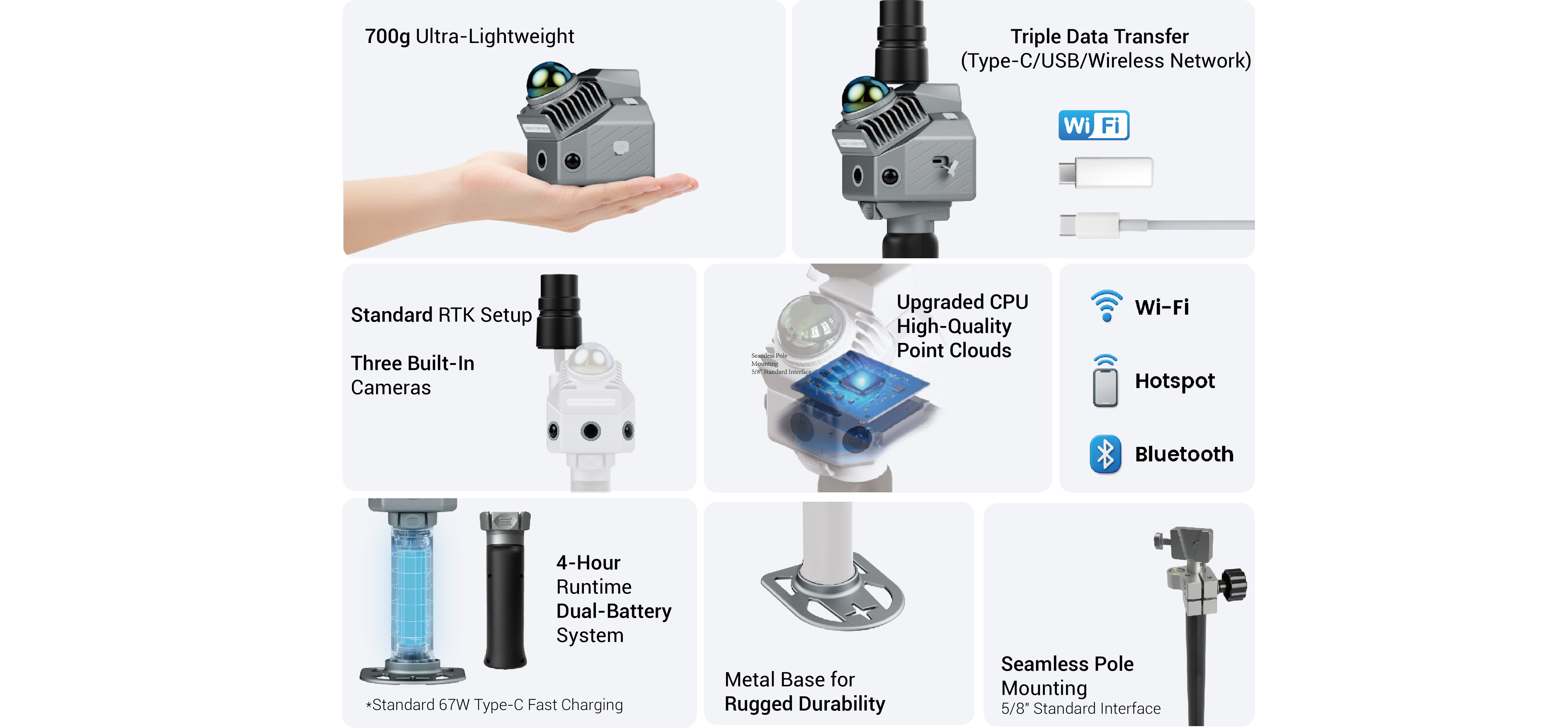 Le scanner LiDAR FJD Trion P2 nouvelle génération allie portabilité révolutionnaire et précision industrielle. Conçu pour des opérations de terrain fluides, il offre une précision centimétrique, des nuages de points colorisés en temps réel et des livrables multiformats, le tout dans un boîtier compact de 700 g. Qu'il s'agisse de cartographier des paysages complexes ou de capturer des détails complexes, le Trion P2 permet aux professionnels, aux géomètres et aux passionnés de numérisation 3D d'en faire plus avec moins d'efforts.